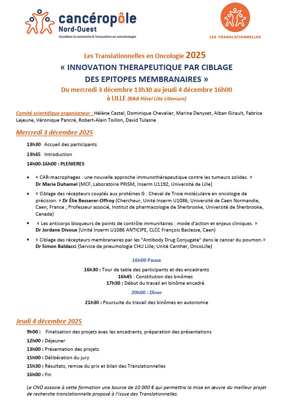 Les Translationnelles en Oncologie 2025 organisées par le cancéropôle Nord-Ouest se tiendront les 3 et 4 décembre 2025 au B&B Hôtel Lille Lillenium, sur la thématique "Innovation thérapeutique par ciblage des épitopes membranaires".